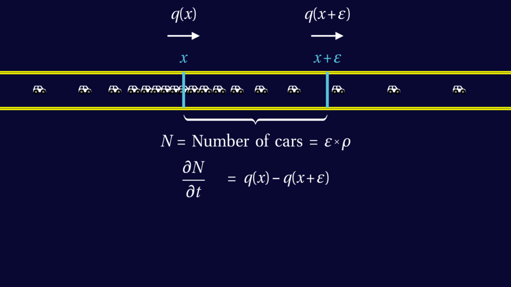 So the change in number of cars over time is given by the difference in flow at \(x\) and \(x+\varepsilon\): $$ \frac{\partial N}{\partial t} = q(x) – q(x+\varepsilon).$$