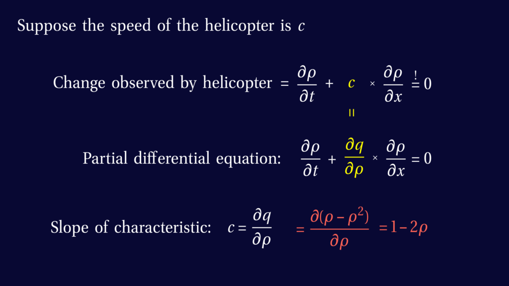 If we compare this to the partial differential equation for the traffic density rho, we see that the equations are almost the same. In particular, if $$ c =\frac{\partial q}{\partial \rho}$$ then the helicopter will see no change in density. This is exactly what we want, so this is the formula for the speed of the helicopter, or in more abstract terms, for the slope of a characteristic.